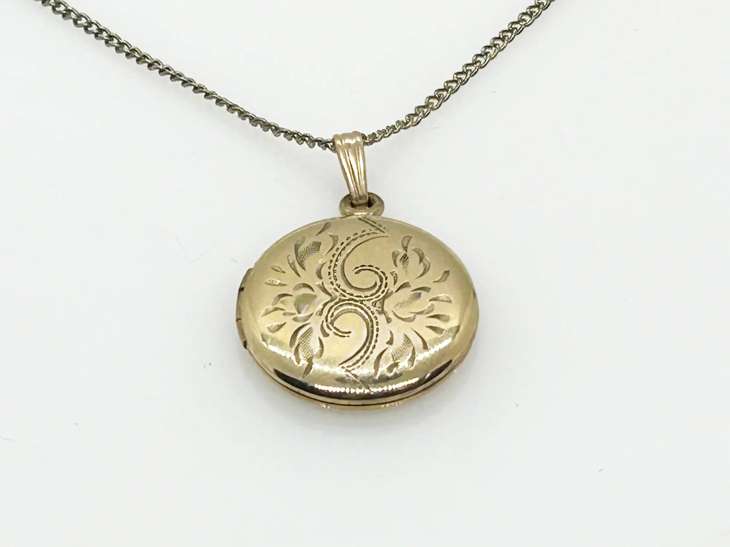 This timeless piece from the late 1960s features carefully engraved detailing on the front and a sleek, polished back. The locket has enough space for two treasured photos or any other keepsake of your choice. Measuring .75" in diameter, it comes with a delicate 17" chain to elevate your look. It has wear on the back appropriate for its age. Perfect for adding a touch of vintage elegance to any outfit.