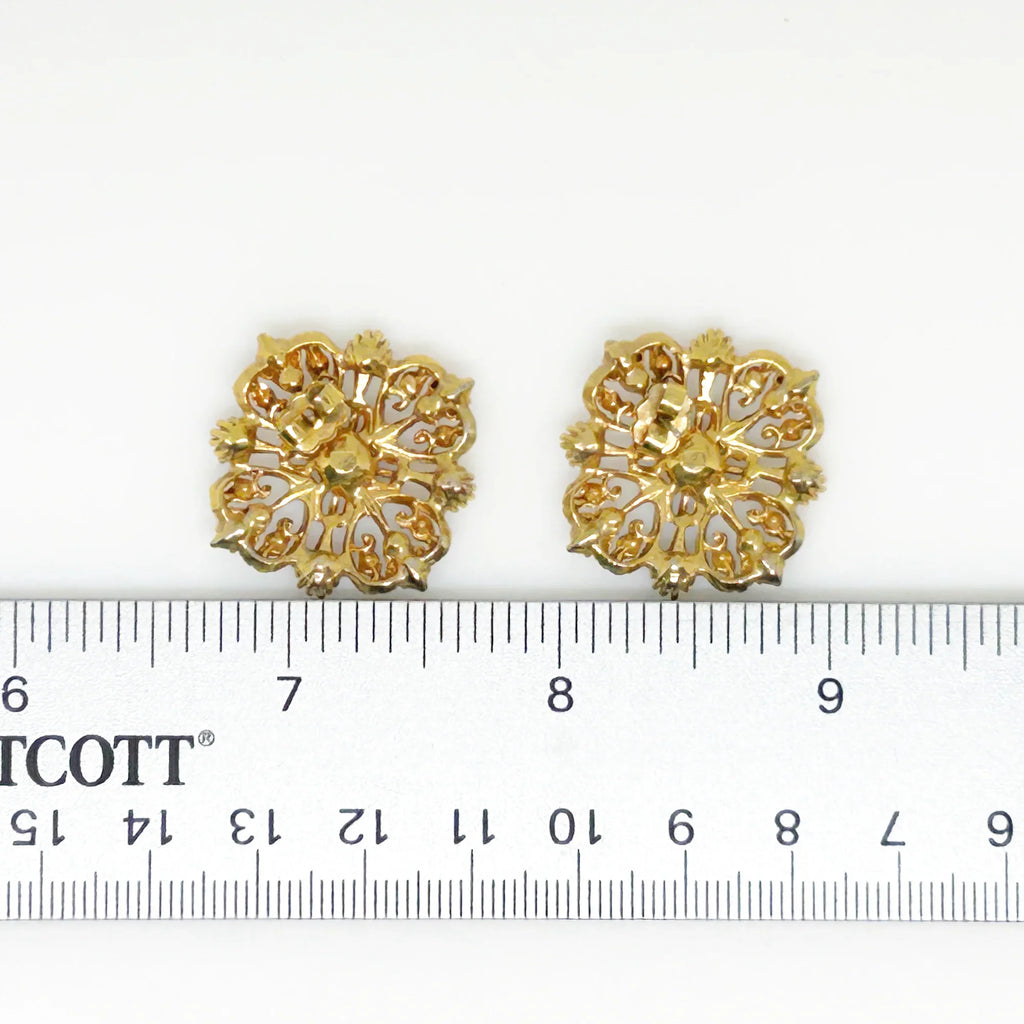 These filigreed vintage red earrings offer an exquisite aesthetic, beautifully detailed with pink, purple, and red chaton rhinestones in a square pattern. Meticulously designed, each earring's dimensions measure 3/4" square.