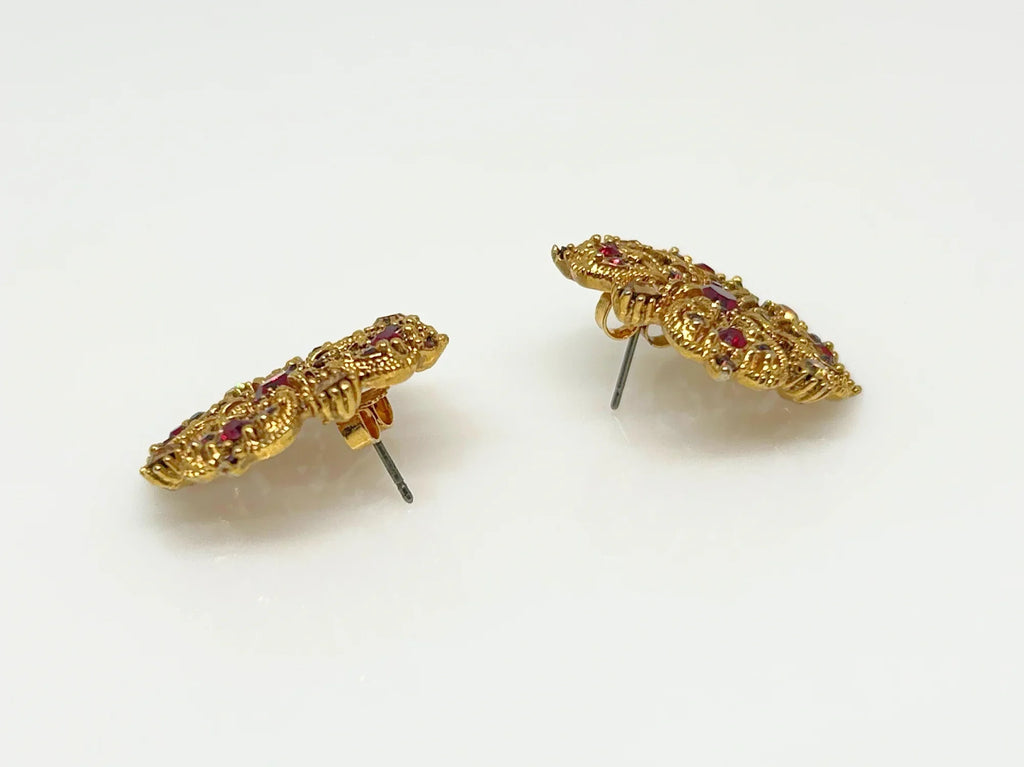 These filigreed vintage red earrings offer an exquisite aesthetic, beautifully detailed with pink, purple, and red chaton rhinestones in a square pattern. Meticulously designed, each earring's dimensions measure 3/4" square. The backs feature a post closure. Indulge in a touch of vintage elegance with these delicately filigreed red earrings. Adorned with pink, purple, and red chaton rhinestones in a unique square pattern, these earrings are a visual delight. The meticulous design and 3/4" square dimensions make them a perfect accessory for any occasion, while the secure post closure ensures comfortable wear. Elevate your style with these exquisite earrings today!