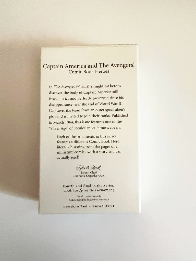 This 4th and final ornament in the series, beautifully handcrafted and dated 2011, is a tribute to the comic book heroes of Captain America and The Avengers. Unleash your inner superhero with this exclusive, limited edition ornament! Crafted in 2011, QX8819, designed by Robert Chad, this collectible is the perfect tribute to Captain America and The Avengers. Proudly display this iconic piece, made in China, as a reminder of your favorite comic book heroes.