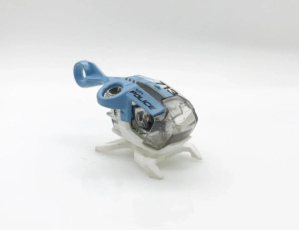 Hot Wheels City Works: light blue and white chopper with "Police" and "713" in black lettering. It has a chrome interior and tinted gray windows.  Made in Malaysia, designed by Dmitriy Shakhmatov.
