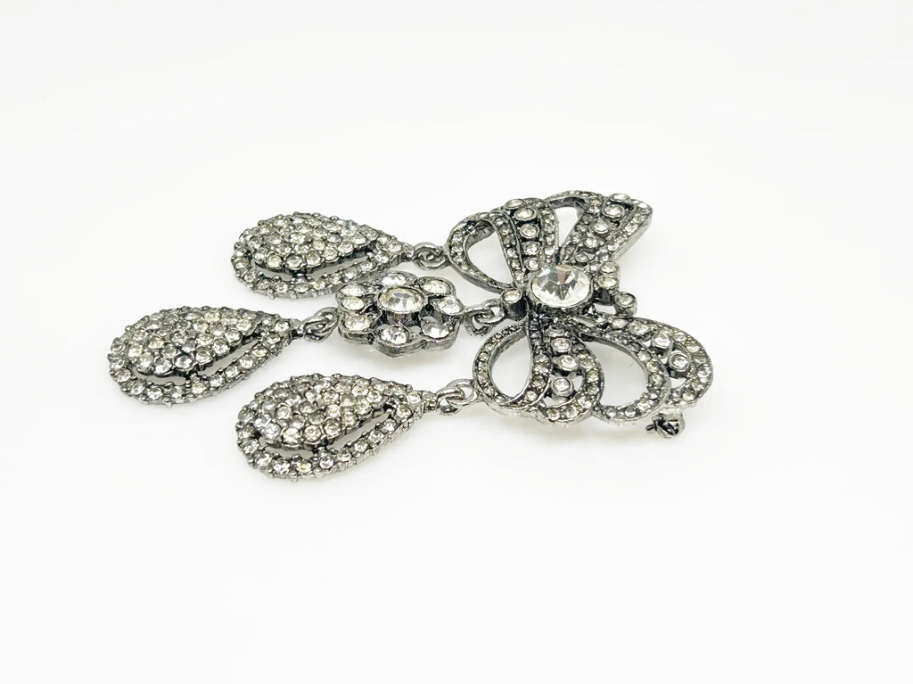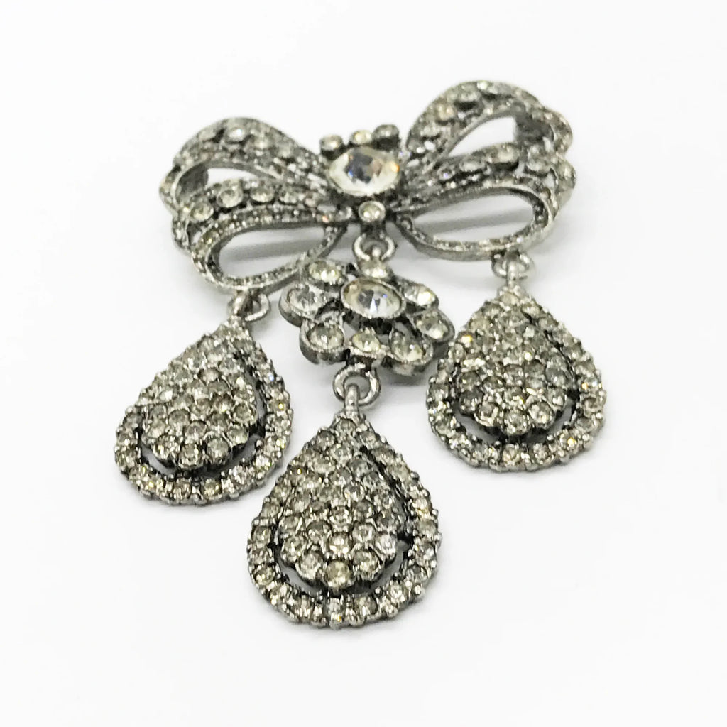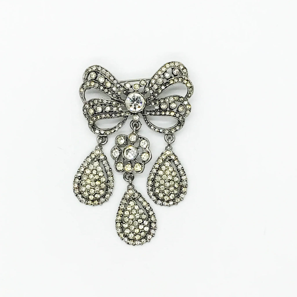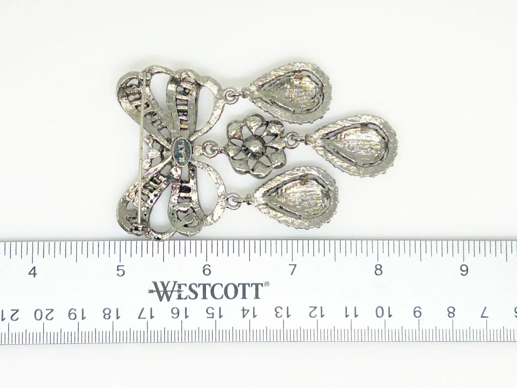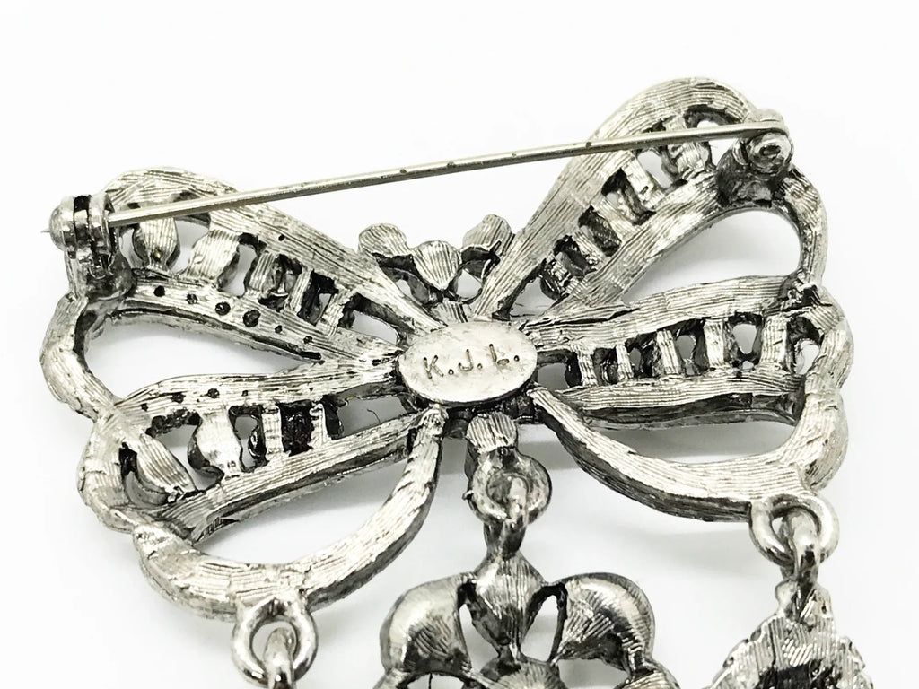This exquisite piece of jewelry, crafted by Kenneth Jay Lane, is a shimmering testament to the exquisite beauty of the 18th century. It is dazzling, with crystal studded bows and gracefully dangling elaborate teardrops.The brooch is set in silver tone metal, its regal size measures 3.25" at its longest drop and 2" at its widest. The designer's signature is embossed on a raised oval at its back. Free Shipping