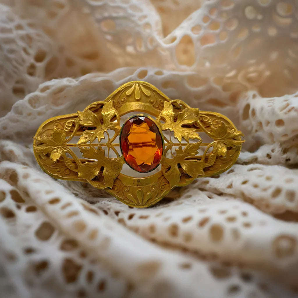 Antique Victorian Brooch Pin With Golden Large Stone and Leaf Detail
