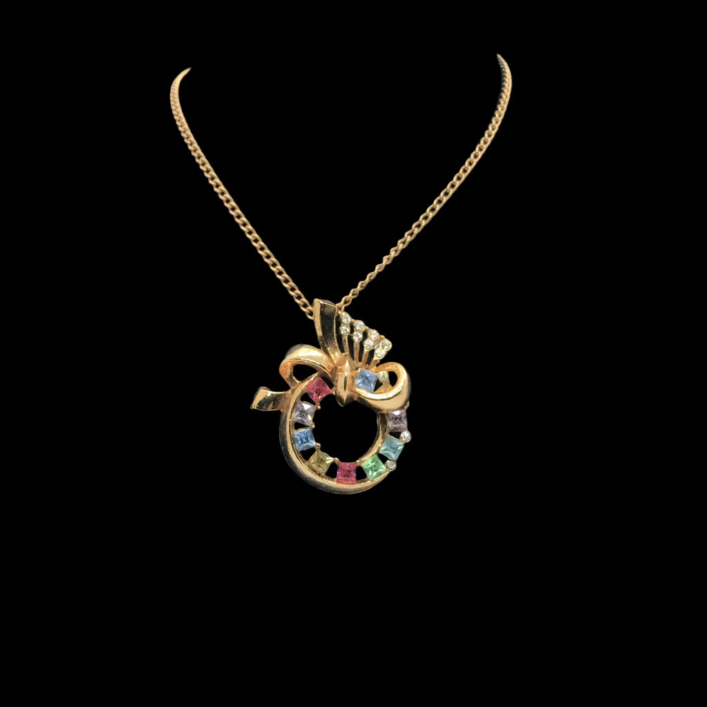This lovely necklace features a round circular pendant studded with pastel colored rhinestones and topped off with a pave set flourish. It comes with a gold tone chain. The pendant measures 1.75” and the chain measures 15” and is signed Lisner in capital letters on the fold over clasp.