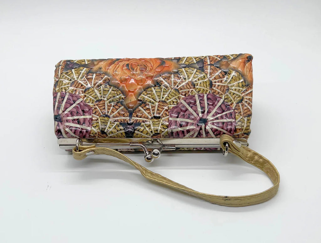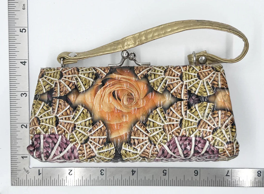 This is very cute tiny purse with floral accents in pink, deep red , brown and greens. It has silver hardware and black lining. The exterior has an intriguing trompe l'oeil effect. The tag reads China. It measures 5" wide by 2 3/4 tall. It has a gold fabric strap.