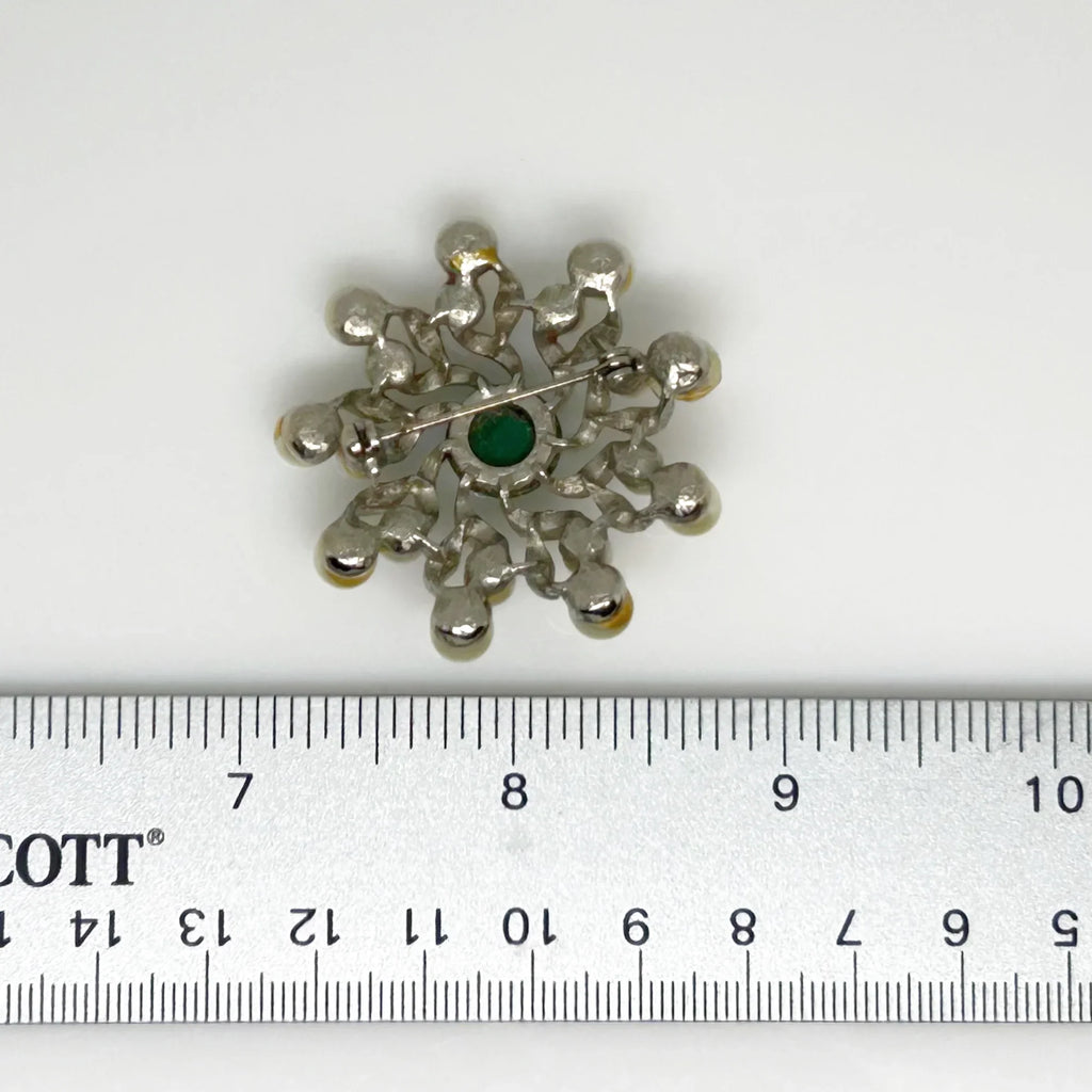 This Vintage Pearl and Green Belle Epoque Style Swirl Brooch is a stunning example of masterful costume jewelry craftsmanship. Radiating a regal charm reminiscent of a treasured royal heirloom, it captivates with its intricate design and very good condition. Measuring 1 3/4" wide, the brooch features a striking green round cabochon centerpiece surrounded by elegant swirling patterns. Cream faux pearls add a soft, classic touch, all set in a lustrous silver-tone metal that enhances its vintage appeal. Perfect for adding a sophisticated, timeless accent to any outfit, this brooch is a rare find for collectors and style enthusiasts alike.