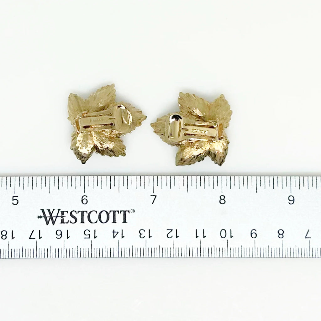 Indulge in the enchanting allure of nature with these Swoboda exquisite leaf earrings, meticulously crafted from lustrous green jade and exquisitely embellished with delicate faux pearls. These captivating earrings boast comfortable clip-on backs, measuring a graceful 1.5 inches, and are securely fastened with robust hinge closures, ensuring a perfect fit and lasting wear. The breathtaking design is elegantly presented in a rich, luxurious gold tone, and it bears the unmistakable signature of the renowned Swoboda script, a testament to its vintage artistry and enduring charm.