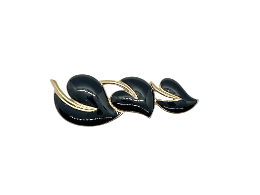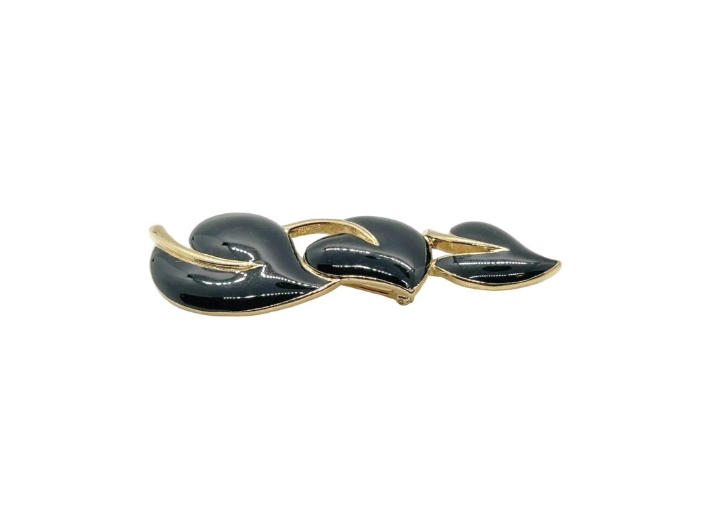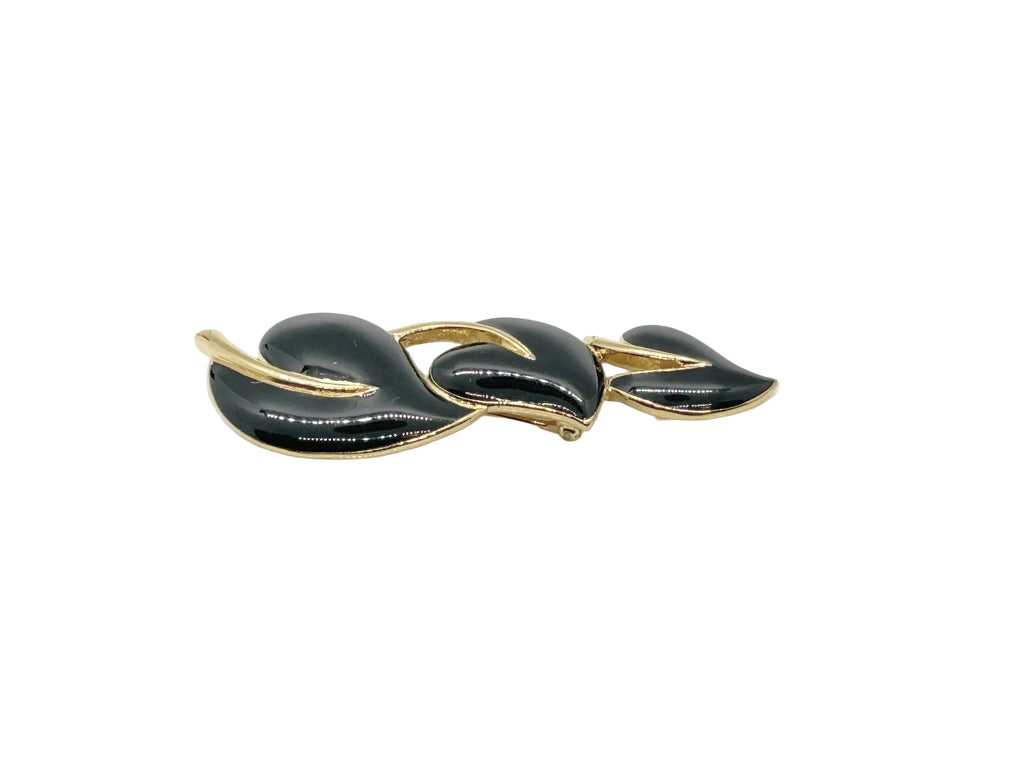Meet your new favorite accessory! This gorgeous Trifari brooch showcases three beautifully crafted black enamel leaves accented with warm gold-tone metal—a timeless design from the 1980s-1990s era. This piece is authentically signed and measures a perfect 2.75" for versatile styling. The secure rollover clasp keeps it safely in place, whether you wear it horizontally or vertically. Whether you're dressing up a blazer or adding vintage charm to your everyday look, this polished brooch brings instant elegance and character to any outfit.