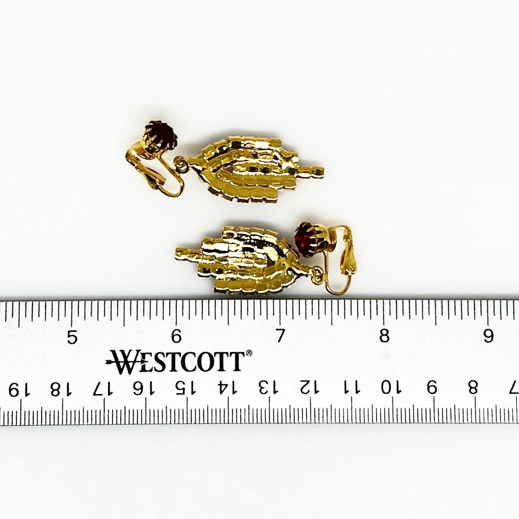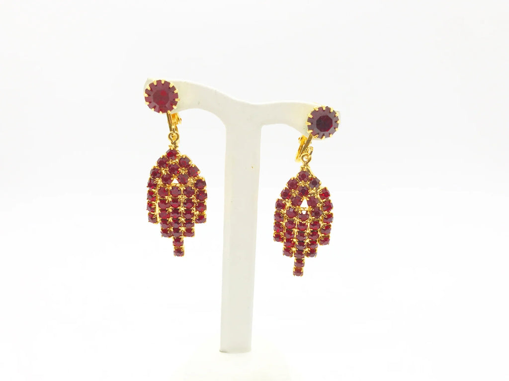 Vintage Art Deco Style Ruby Red Rhinestone Dangle Clip-On Earrings