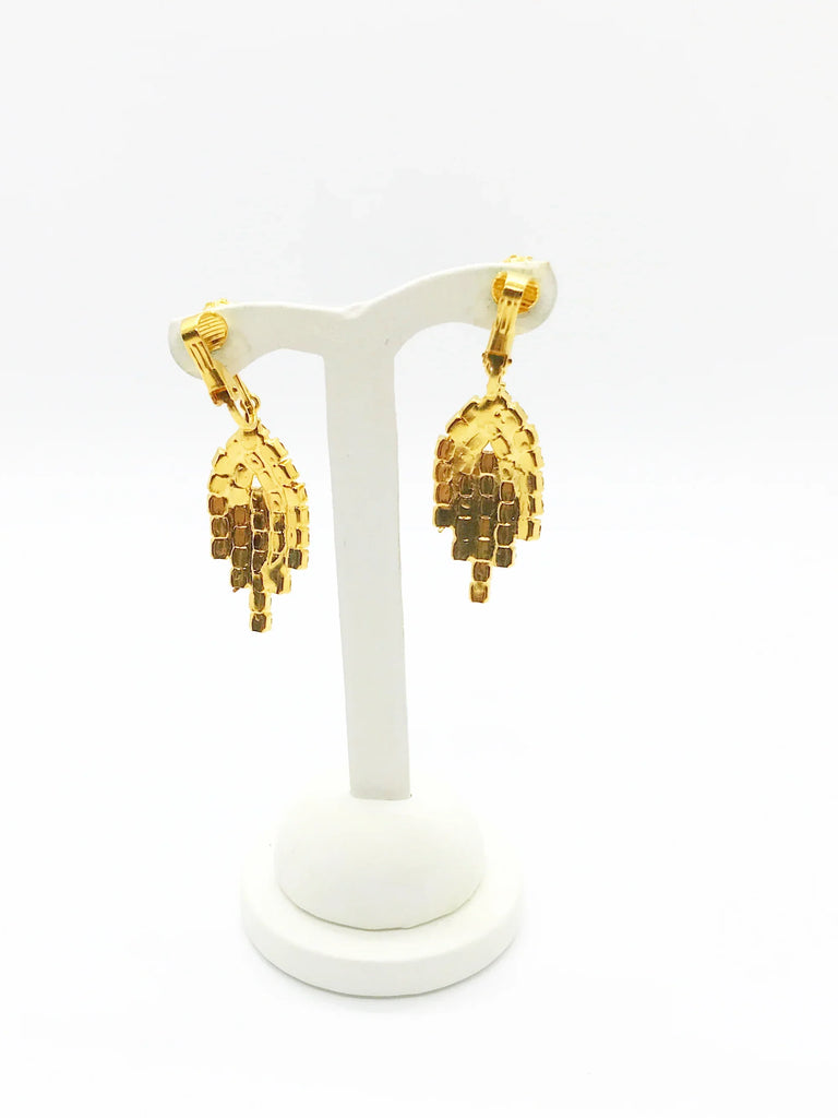 These vintage Art Deco Style ruby red clip-on earrings are a dazzling display of elegance. Featuring vibrant, bright red, sparkling round rhinestones that shimmer within a lustrous gold-tone setting, these earrings are a captivating blend of vintage charm and modern wear ability. Their classic design evokes Art Deco aesthetics while remaining comfortable and fun to wear. Each earring measures approximately 2 inches in length. The drops measure 1.25" . This vivid set is presented in near-mint condition and secured with comfortable, secure hinge backs, ensuring a pleasant and stylish experience.