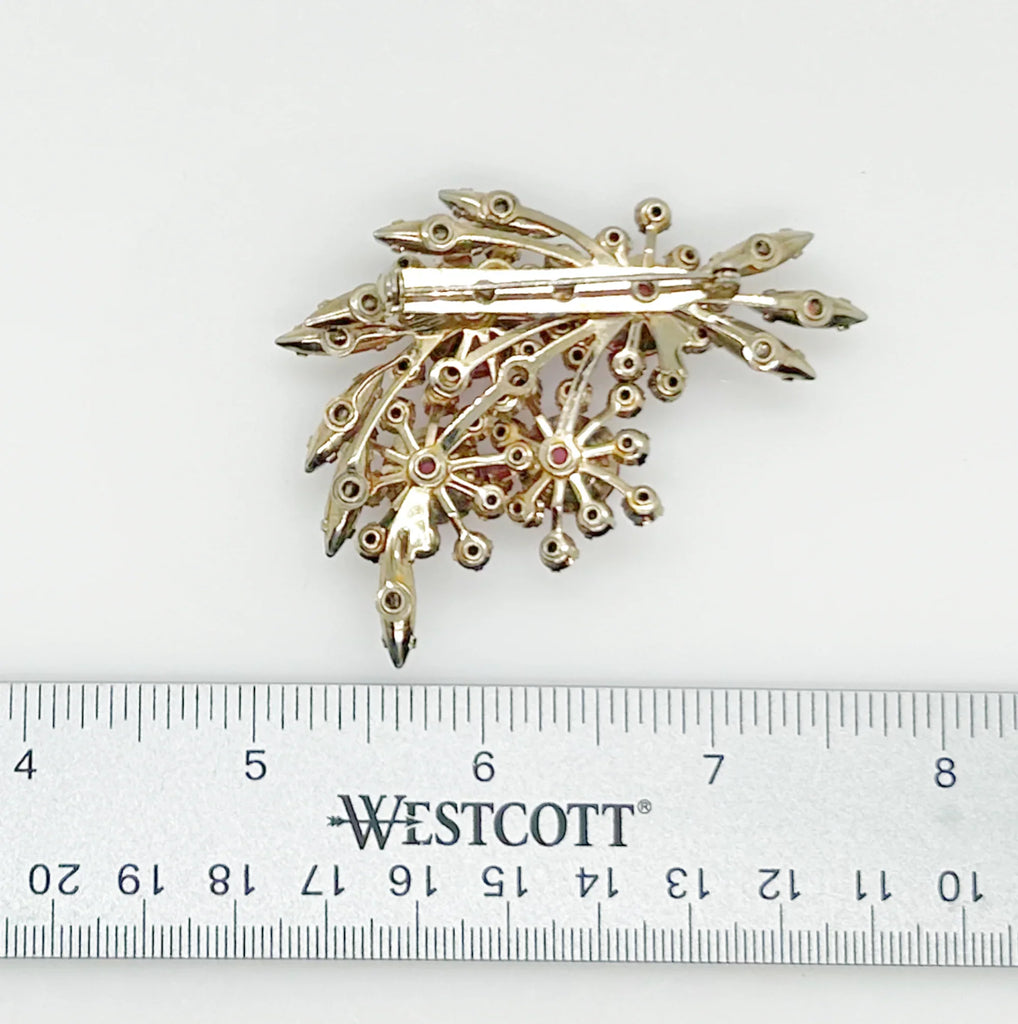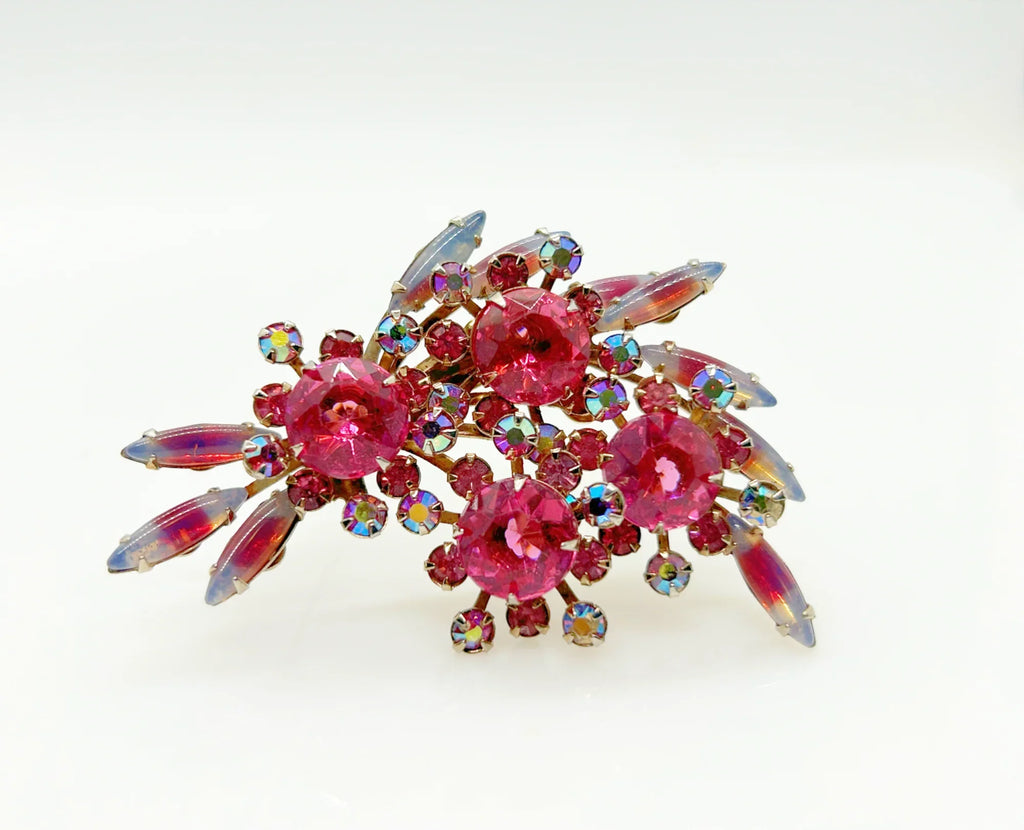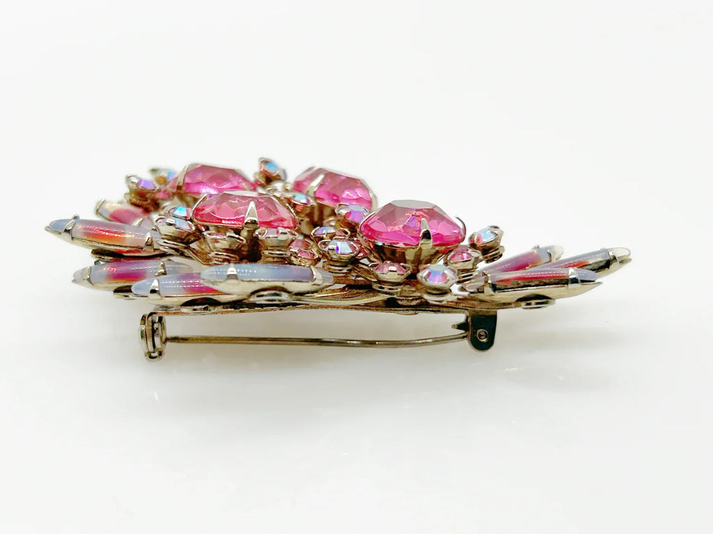 Add a touch of unique style and vibrance to any outfit with this stunning vintage pink unsigned Beau Jewels brooch. Featuring a captivating design of four layers and various shades of pink stones, including a vibrant round faceted pink stone at the center of each section. It is surrounded by round pink iridescent and vivid stones, as well as several striped watermelon marquise cabochon glass stones for a unique finishing touch. Crafted with high-quality, gold-tone metal, this brooch measures 2.75" at its widest point has a riveted back. It is sure to become a treasured addition to your jewelry collection. Elevate your style and express your individuality with Pink Brooch today!