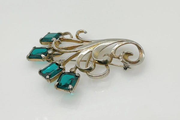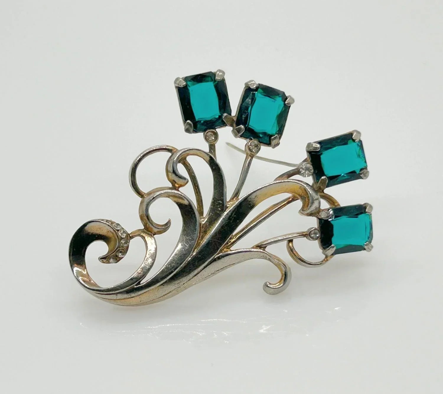 Vintage Abstract Floral Brooch with Clear Green Square Stones
