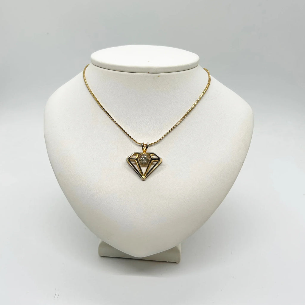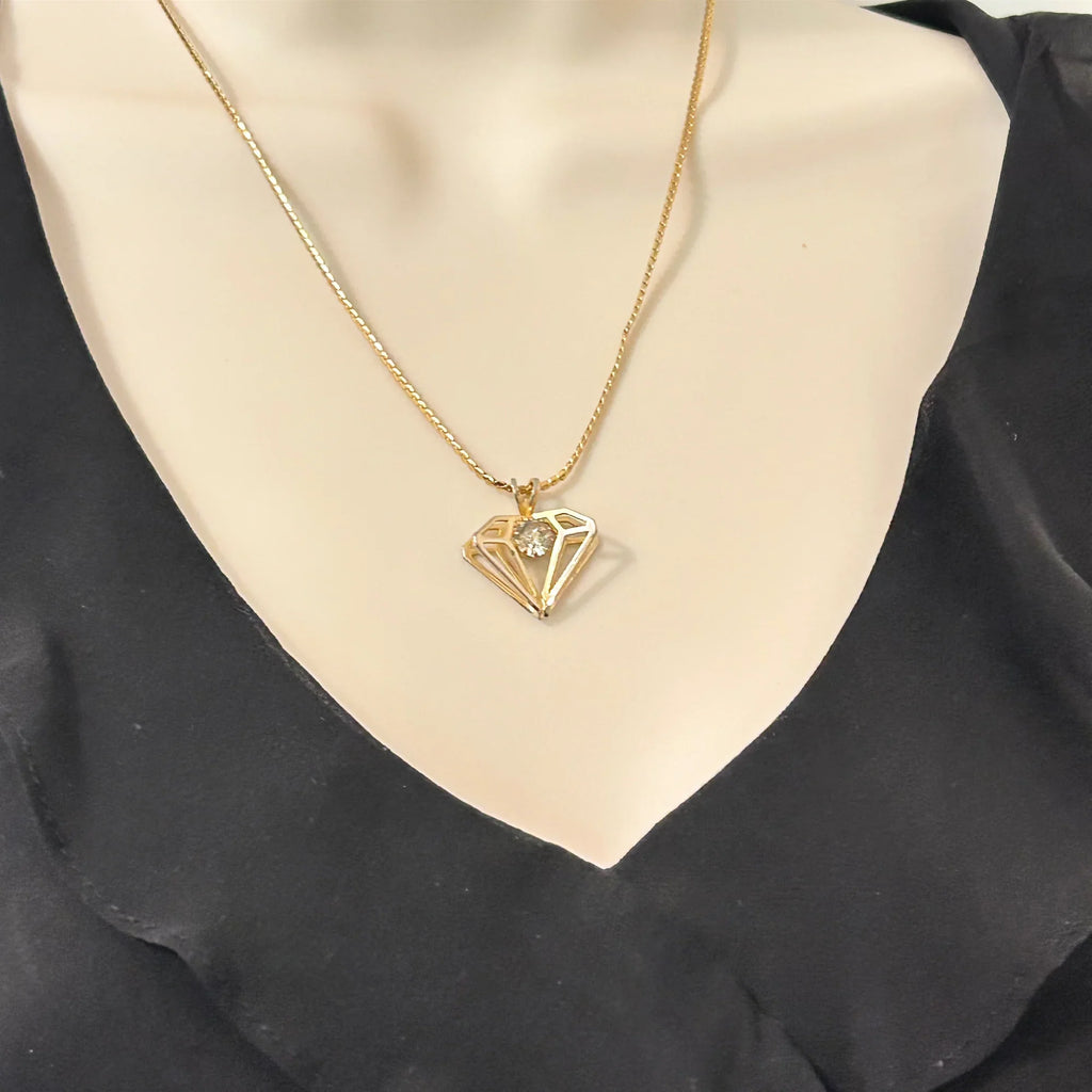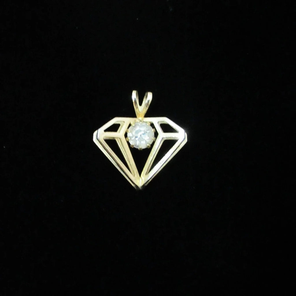 Constructed with a gold metal setting and a round rhinestone, this vintage, diamond-shaped pendant displays a three-dimensional design and measures approximately one inch in width. In pristine condition. Add a touch of elegance to your outfit with this timeless, vintage pendant featuring a stunning round rhinestone in a classic diamond shape. The three-dimensional design and intricate gold metal setting make it a truly unique piece. Perfect for any occasion, this pendant measures approximately 1" inch in width and is in good condition. The chain is included so that you can wear it or gift it immediately. Add to your style with this one-of-a-kind accessory!