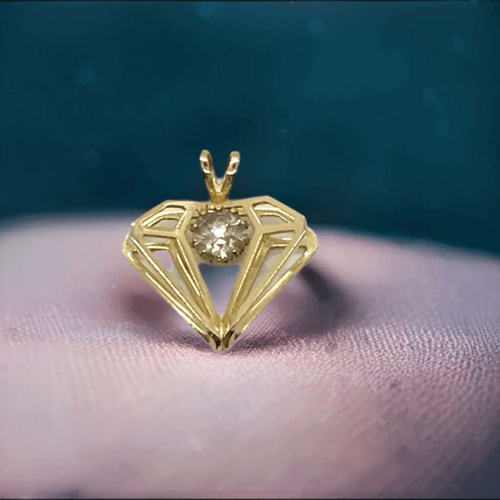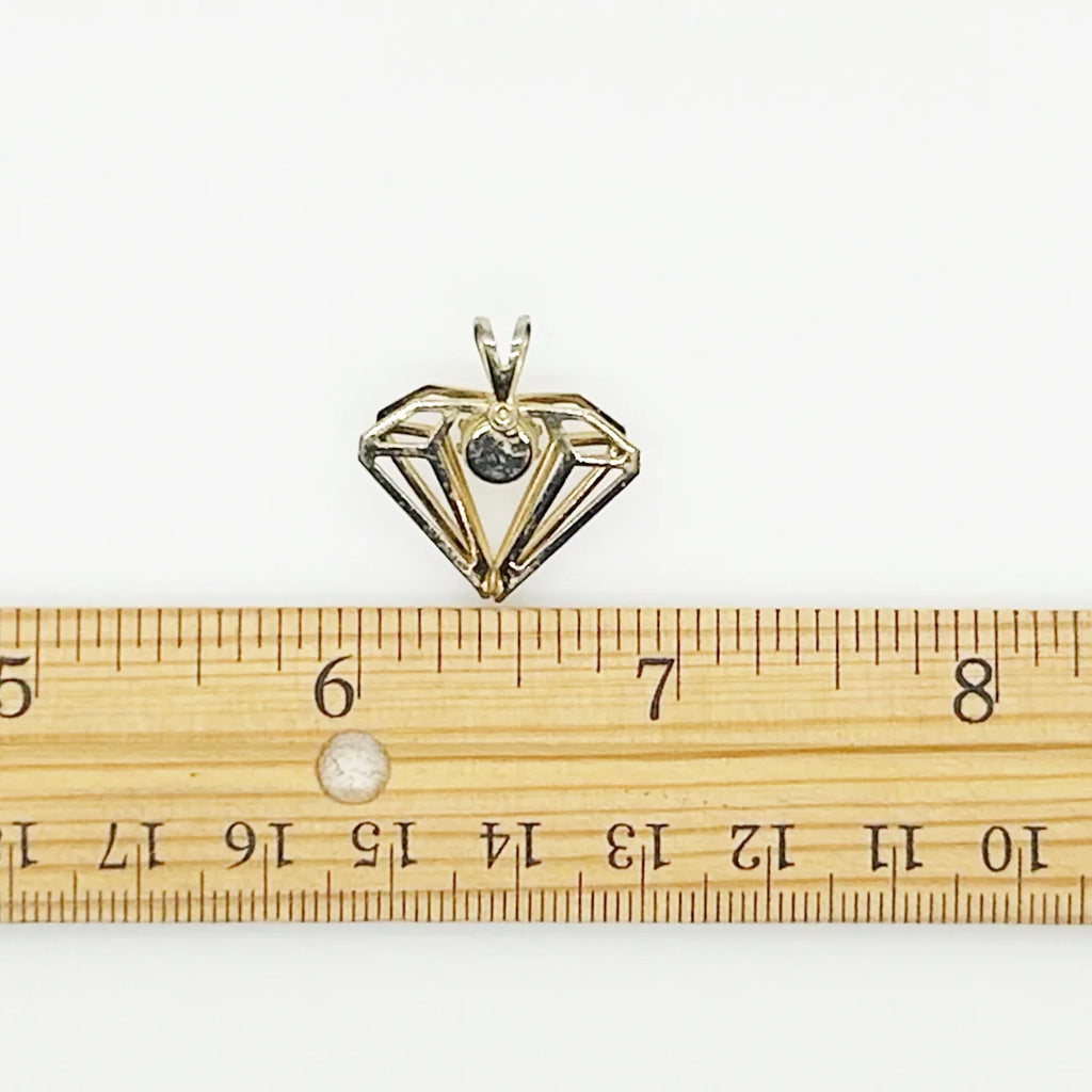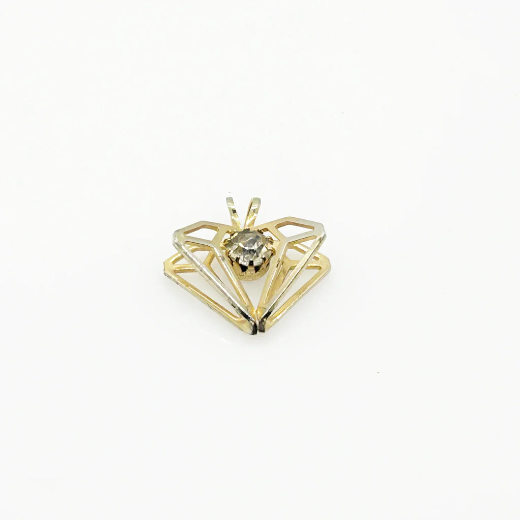 Constructed with a gold metal setting and a round rhinestone, this vintage, diamond-shaped pendant displays a three-dimensional design and measures approximately one inch in width. In pristine condition. Add a touch of elegance to your outfit with this timeless, vintage pendant featuring a stunning round rhinestone in a classic diamond shape. The three-dimensional design and intricate gold metal setting make it a truly unique piece. Perfect for any occasion, this pendant measures approximately 1" inch in width and is in good condition. The chain is included so that you can wear it or gift it immediately. Add to your style with this one-of-a-kind accessory!
