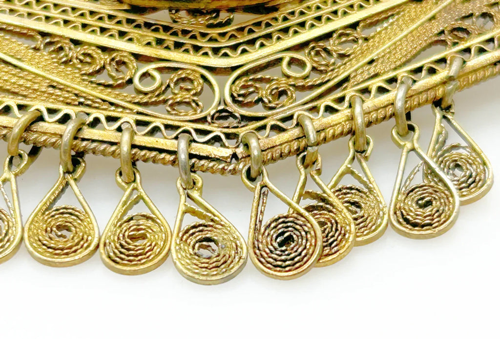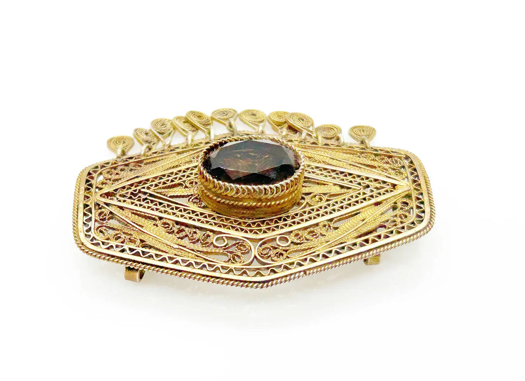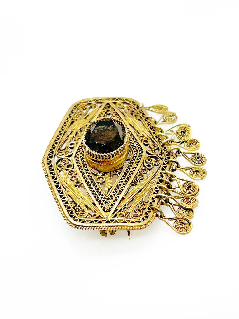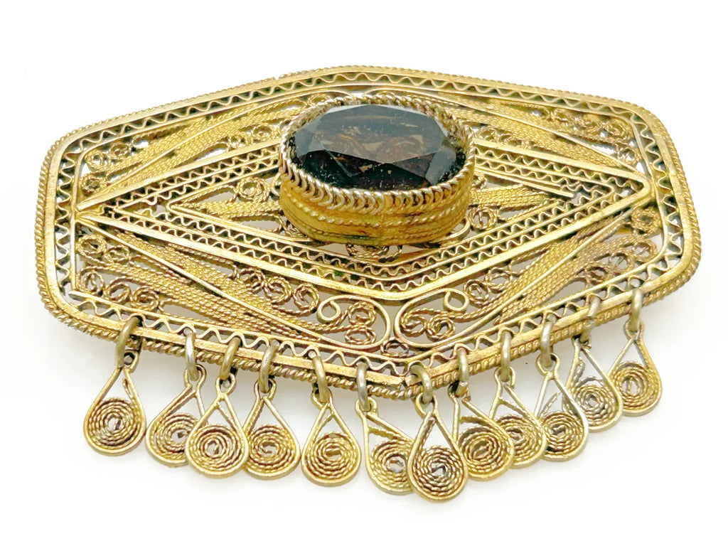 Vintage Israel Filigree Brooch/pendant with Tassels and Smokey Quartz center Stone.It has a geometric shape with small filigree drops at the bottom, and a large, faceted oval stone is the centerpiece. This type of filigree work often employs traditional Yemenite jewelry techniques brought to Israel by immigrants in the mid-20th century. The metalwork is extremely intricate and detailed, both front and back. It measures approximately 2.75 Inches wide x 2.25" Tall. There is a square plaque on the back reading Israel in block letters, with three characters below. The only flaw I can see is a break in the ribbon on the left bottom. Free Shipping