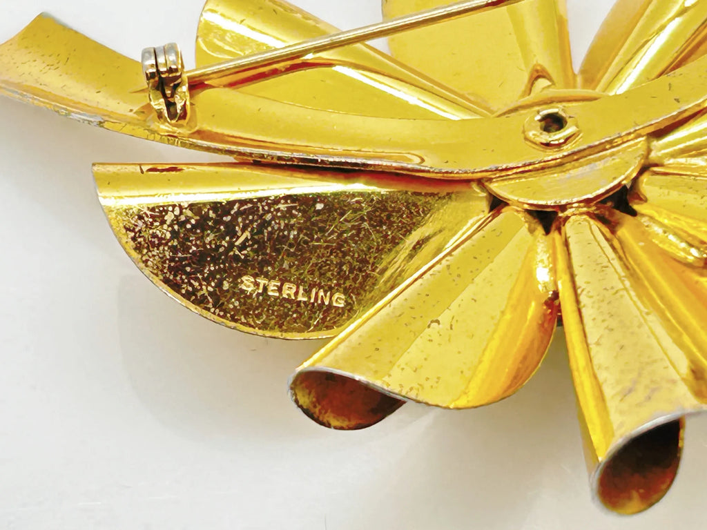 This is a an exemplary example of the floral pins made in sterling with a gold wash from the last century. A purple faceted stone is surrounded by smaller purple stones, and three more accent the top of a petal. The metalwork is wonderfully crafted. The brooch measures 3” long. It is in very good vintage condition; please see photos for detail on metal condition. Free Shipping