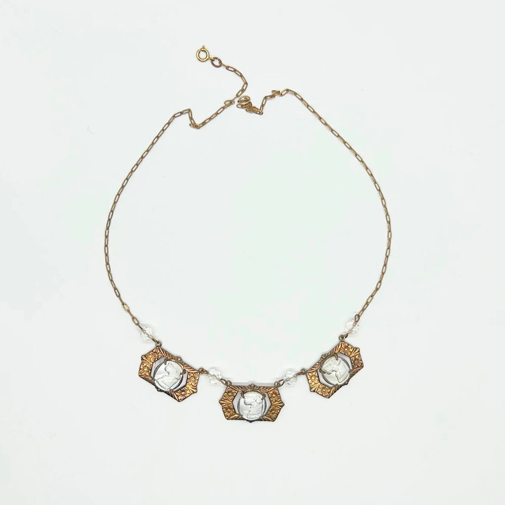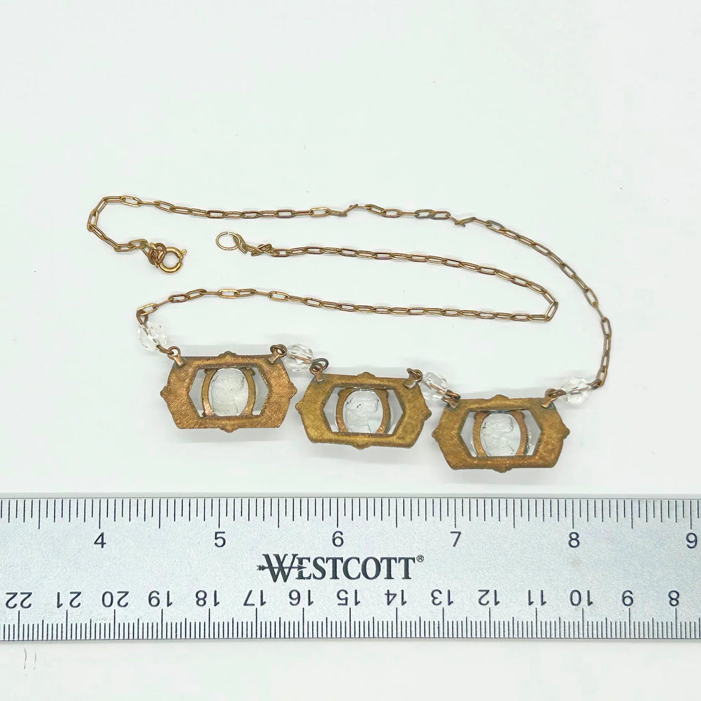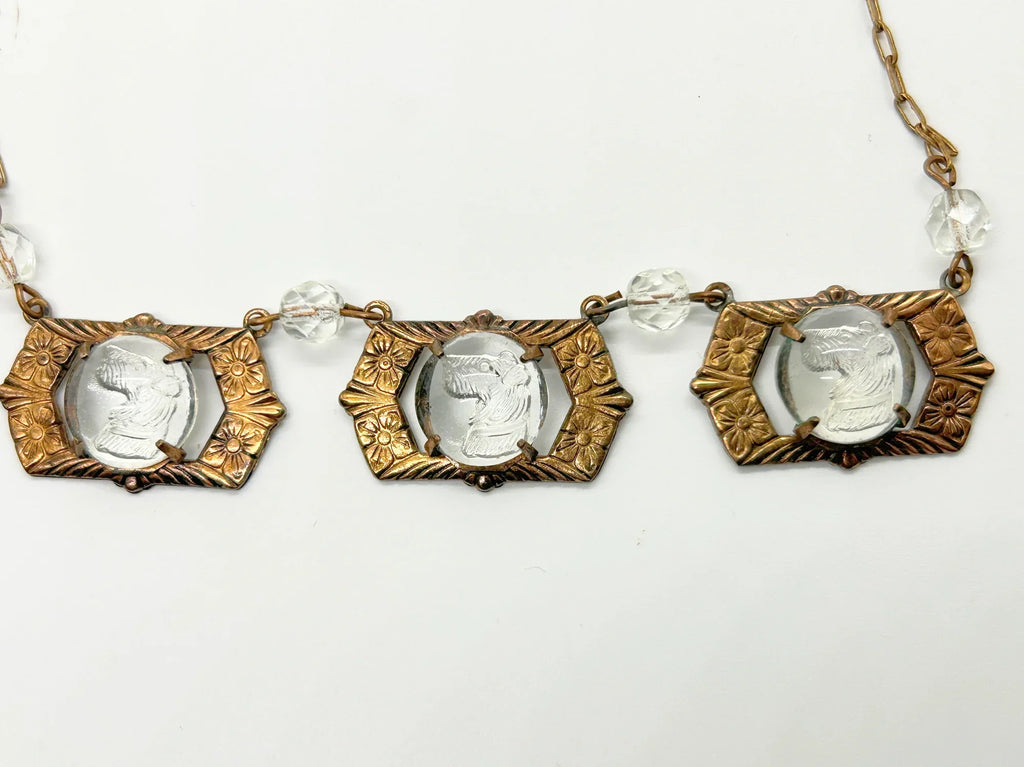 Indulge in the timeless charm of our Vintage Necklace with Clear Carved Scottie Links. This one-of-a-kind piece features three delicately carved panels showcasing the profile of a beloved terrier or Schnauzer. Each panel is encased in intricately designed brass or bronze frames, embellished with clear round crystals. The panels are perfectly aligned and placed on a stylish paperclip chain, measuring 18 inches in length. Captivating and secure with a spring clasp, this necklace is a must-have for any dog lover. Add a touch of elegance and nostalgia to your wardrobe with this stunning piece. Free Shipping