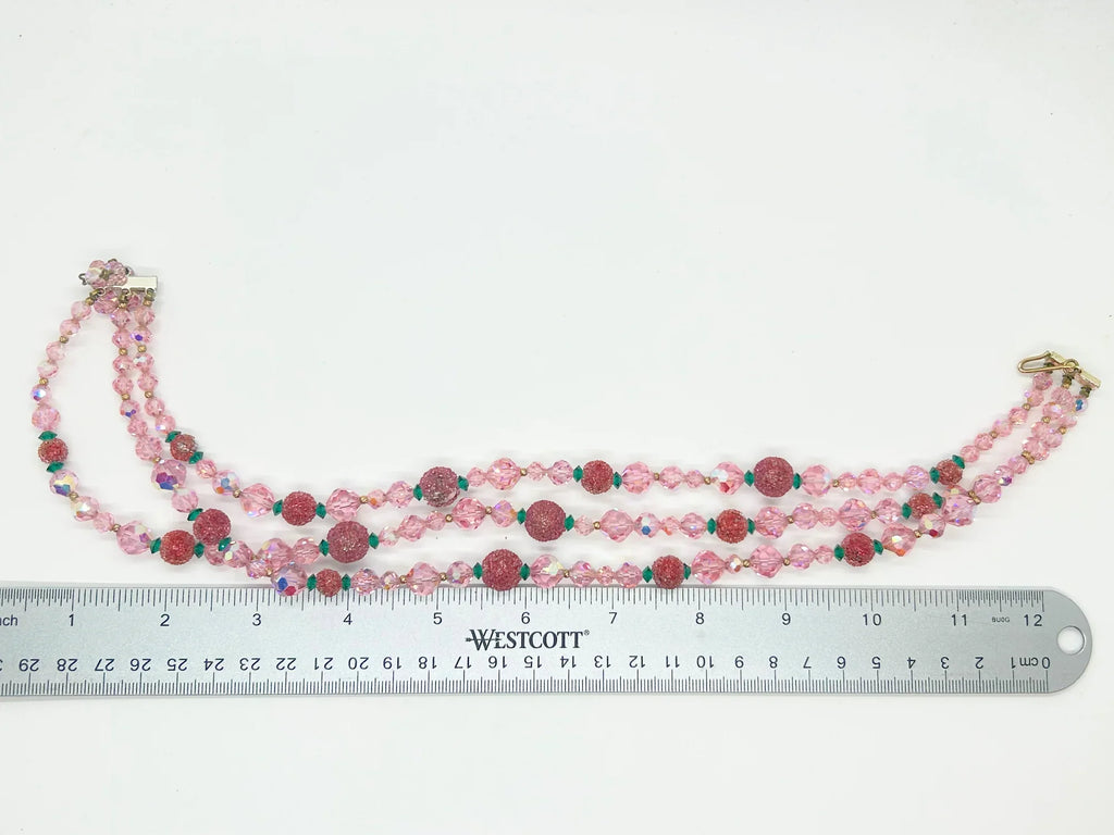 Add a touch of vintage glamour to your look with this stunning necklace and earring set. Three strands of glittering beads in rich pink, red, and green hues create a dazzling effect. The matching earrings add the perfect finishing touch to any outfit. Measuring at 15.5", 15", and 14" respectively, the necklace can be easily adjusted with a 2.5" extender. The silver tone adds a touch of elegance to this already stylish set. Don't miss out on this one-of-a-kind vintage find in great condition! Free Shipping