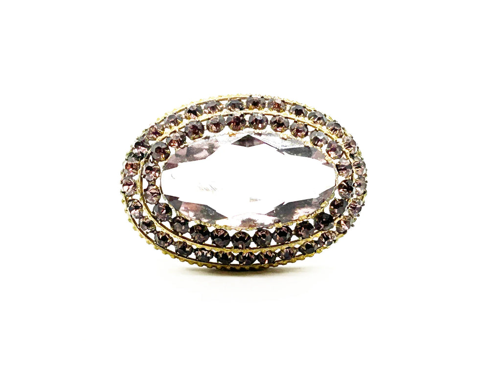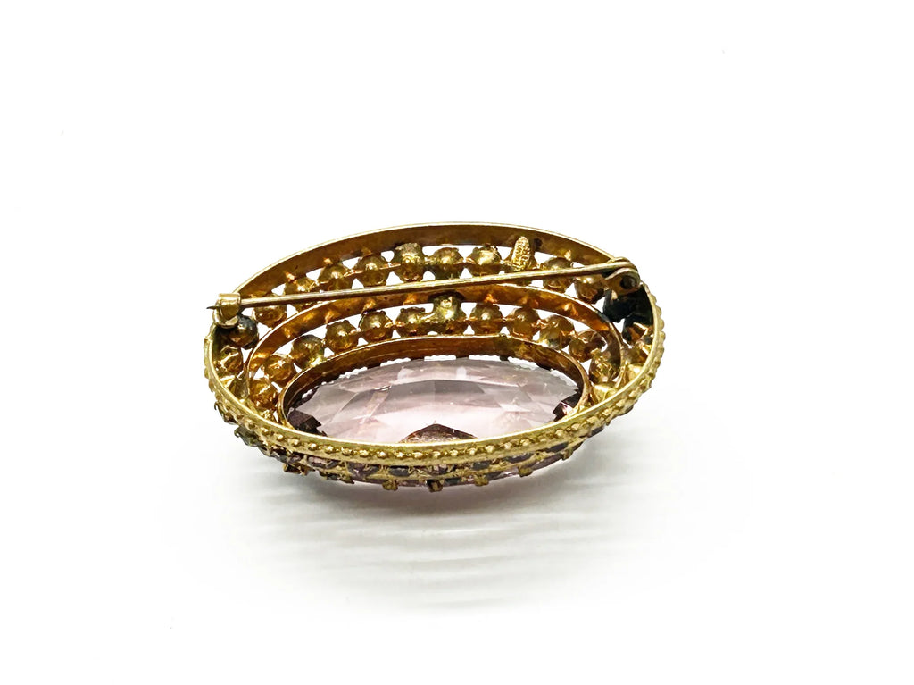 This stunning vintage brooch showcases layers of lavender and purple hues, featuring carefully arranged pink and mauve round stones set within ornate metalwork. A striking oval purple stone crowns the design, creating an eye-catching focal point. At 2.5" in diameter, it makes a bold statement piece that elevates any outfit. The secure C clasp ensures reliable wear, while the intricate craftsmanship and rich color palette deliver timeless elegance. Perfect for collectors seeking distinctive vintage jewelry with genuine character and sophistication. Free Shipping