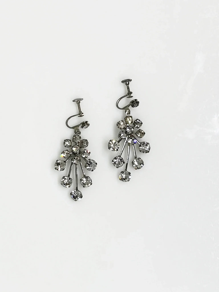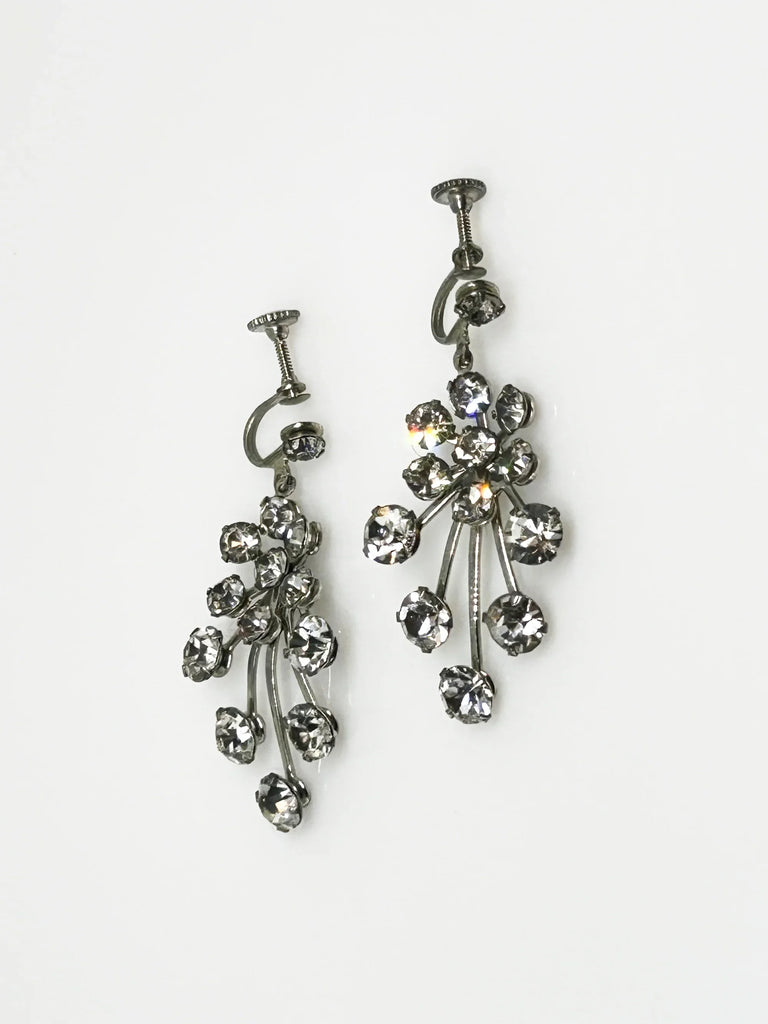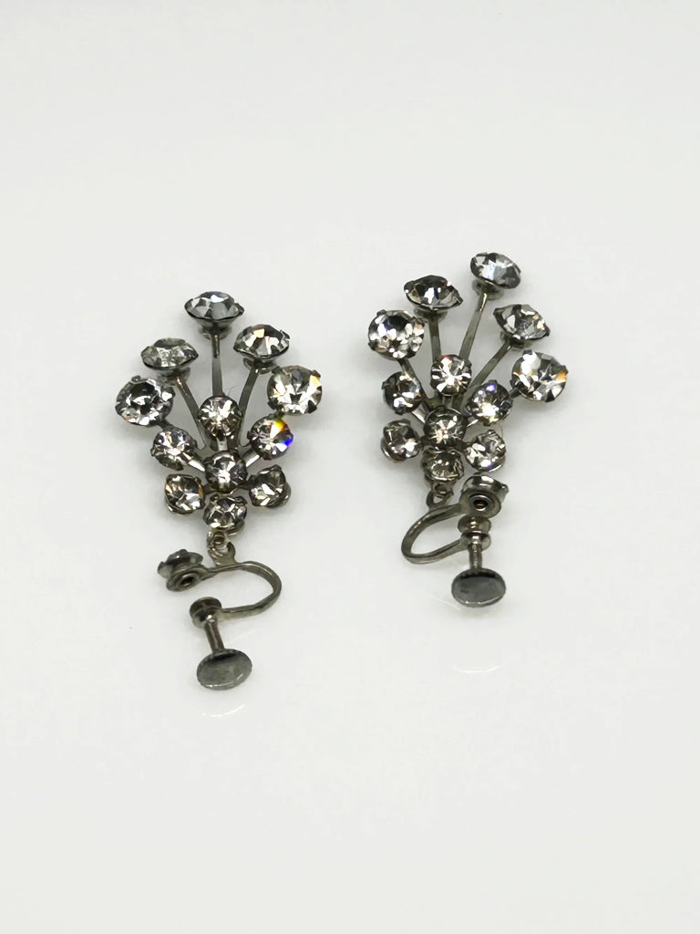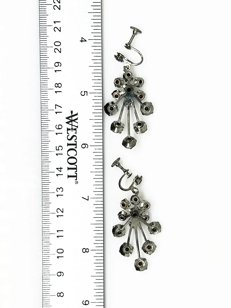 Enhance your elegance with these exquisite vintage drop earrings adorned with varying sizes of round rhinestones, intricately arranged to create a sophisticated design. Watch as they sway gracefully with your every movement, brilliantly reflecting light. These earrings feature screw-back closures and a sleek silver tone, measuring 2" in height and in pristine condition.