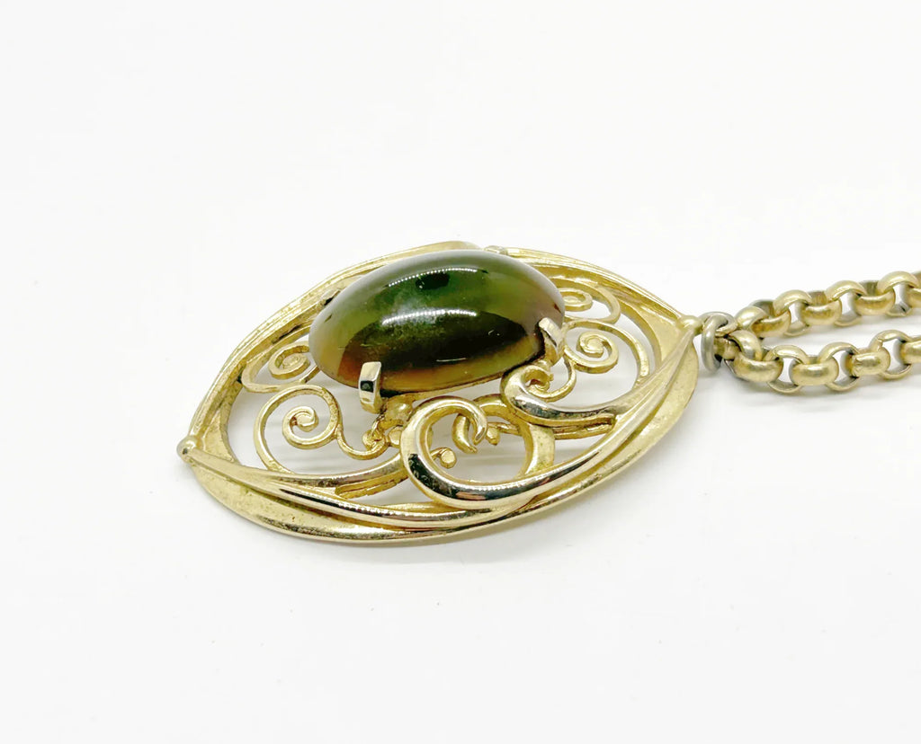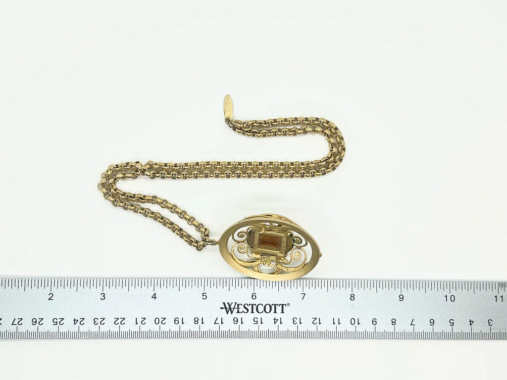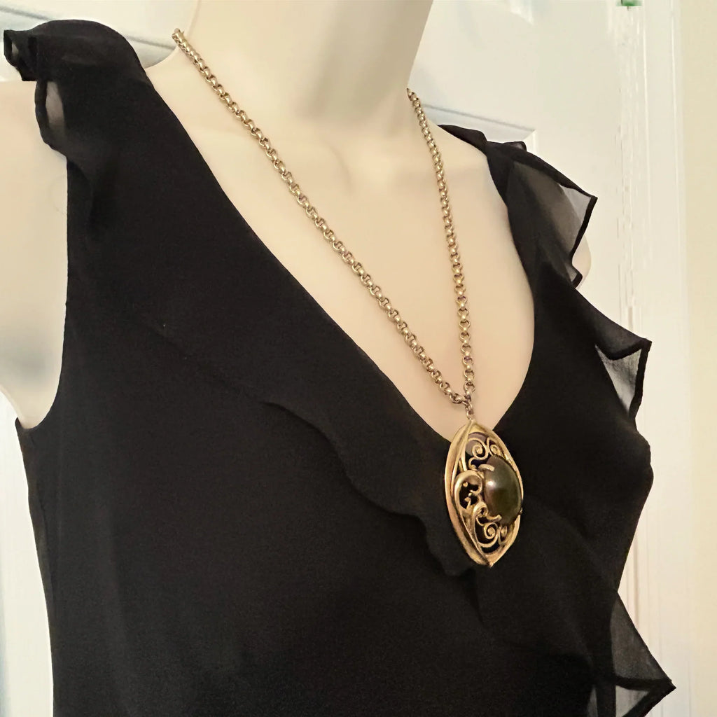This Whiting Davis is a substantial piece, with a bold chain and attention-getting pendant. The pendant is a slightly domed oval, with an oval cabochon setting in the center, surrounded by curlicues. The belcher chain measures 20.5" inches long and the pendant measures 2.25" long. The stone in the center sometimes looks like tiger's eye, other times it looks more green. It is signed Whiting Davis on the hang tag. Free Shipping