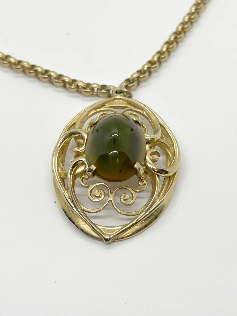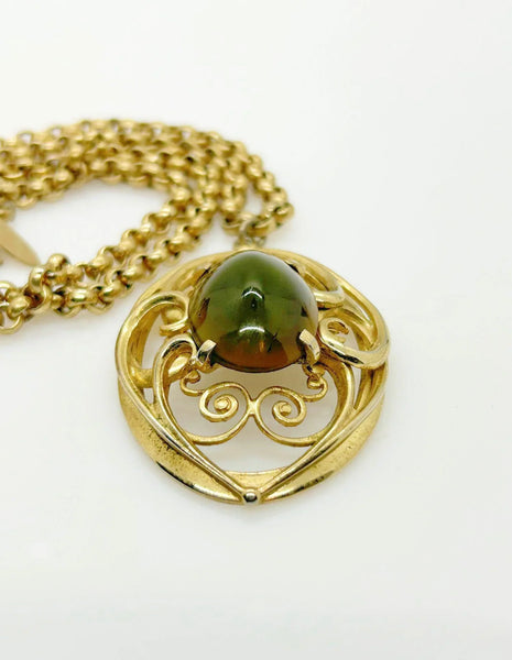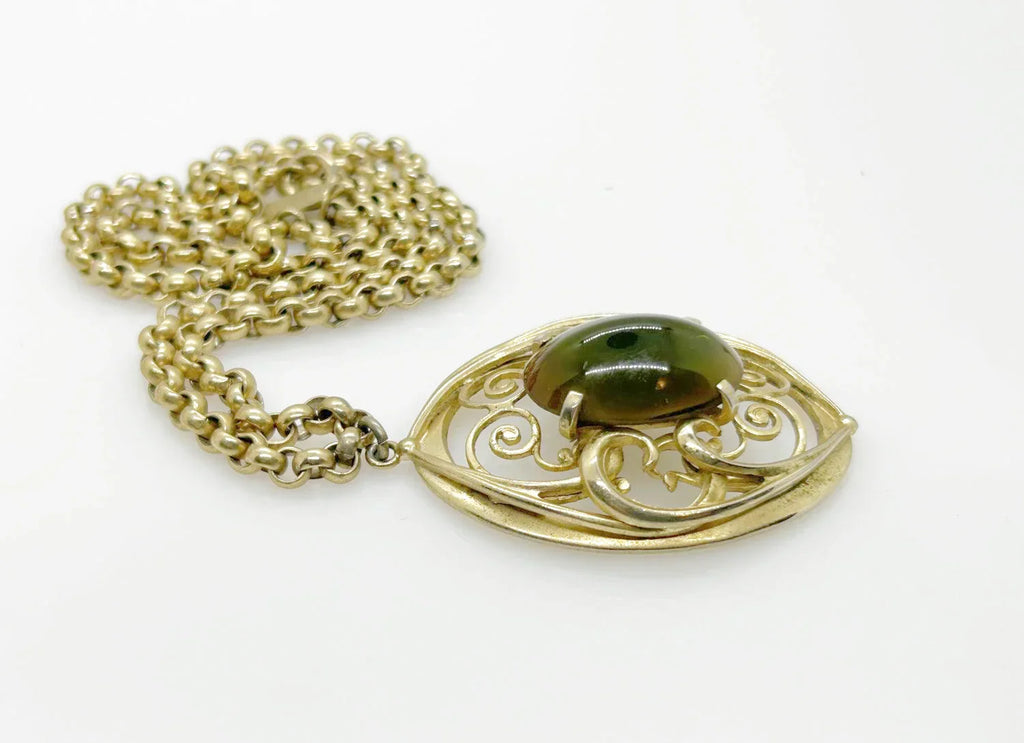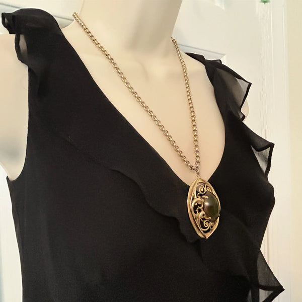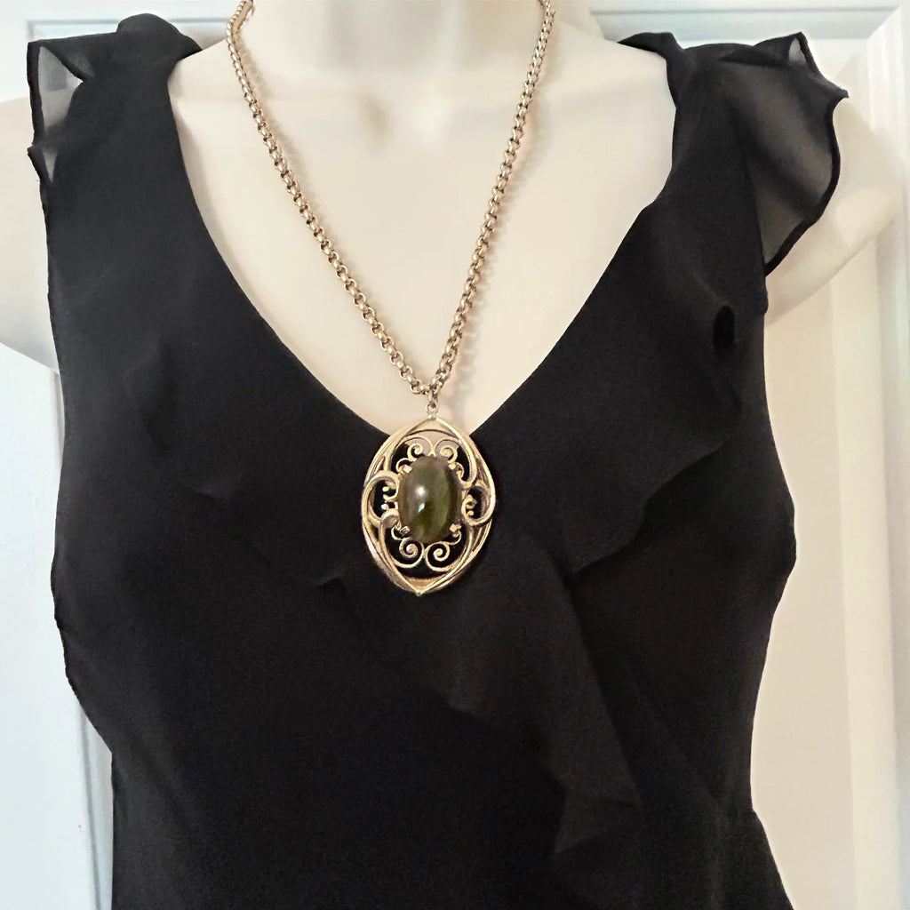 Vintage Whiting Davis Necklace with Dramatic Oval Olive Green Cabochon Pendant